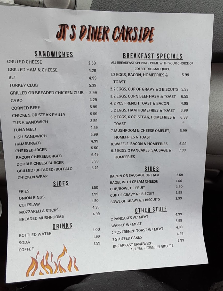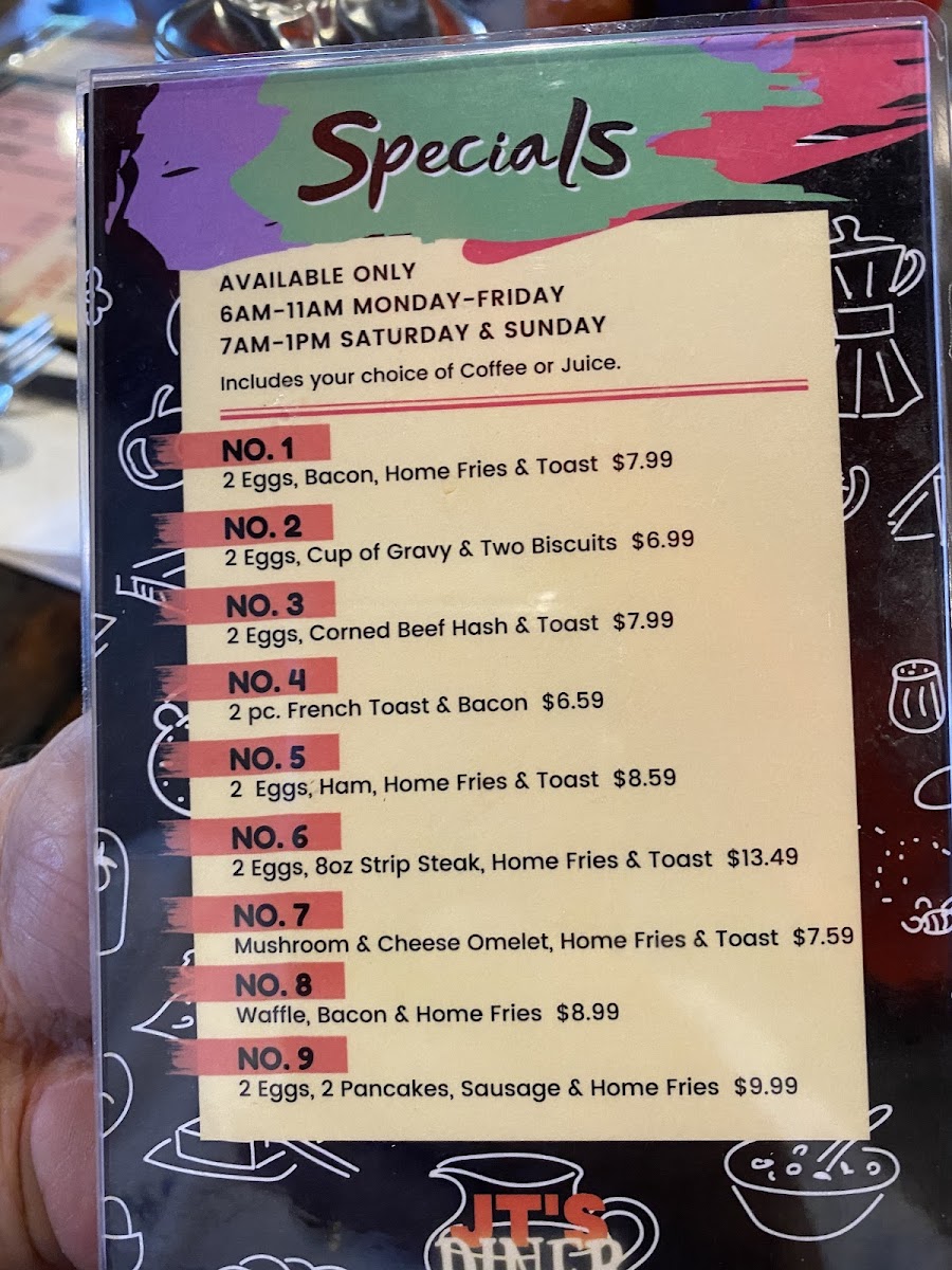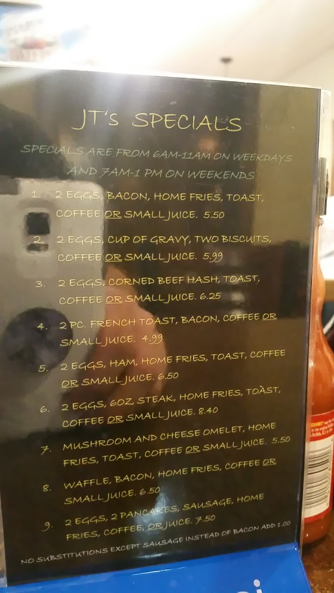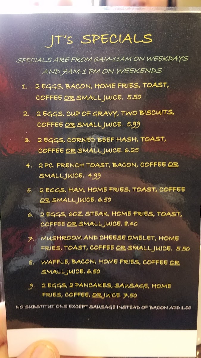 The menu at J T's Diner offers a straightforward selection of classic breakfast and diner favorites, perfect for starting the day or enjoying a casual meal. This is the kind of place where comfort food meets simple, no-fuss preparation, creating a warm and familiar dining experience.